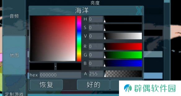 2、海的颜色:点击设置,点击方框处,在弹出的窗口调整颜色,选好后点应用即可。