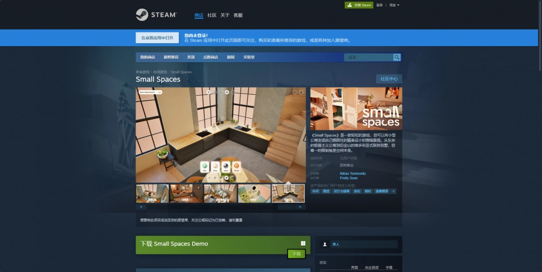 《Small Spaces》是Niklas Tomkowitz制作Pretty Soon发行的一款设计建造游戏,而这款游戏的下载网址就是购买平台的购买页面,比如Steam版就是在购买页面购买之后,点击页面中的马上开玩就可以开始下载了。